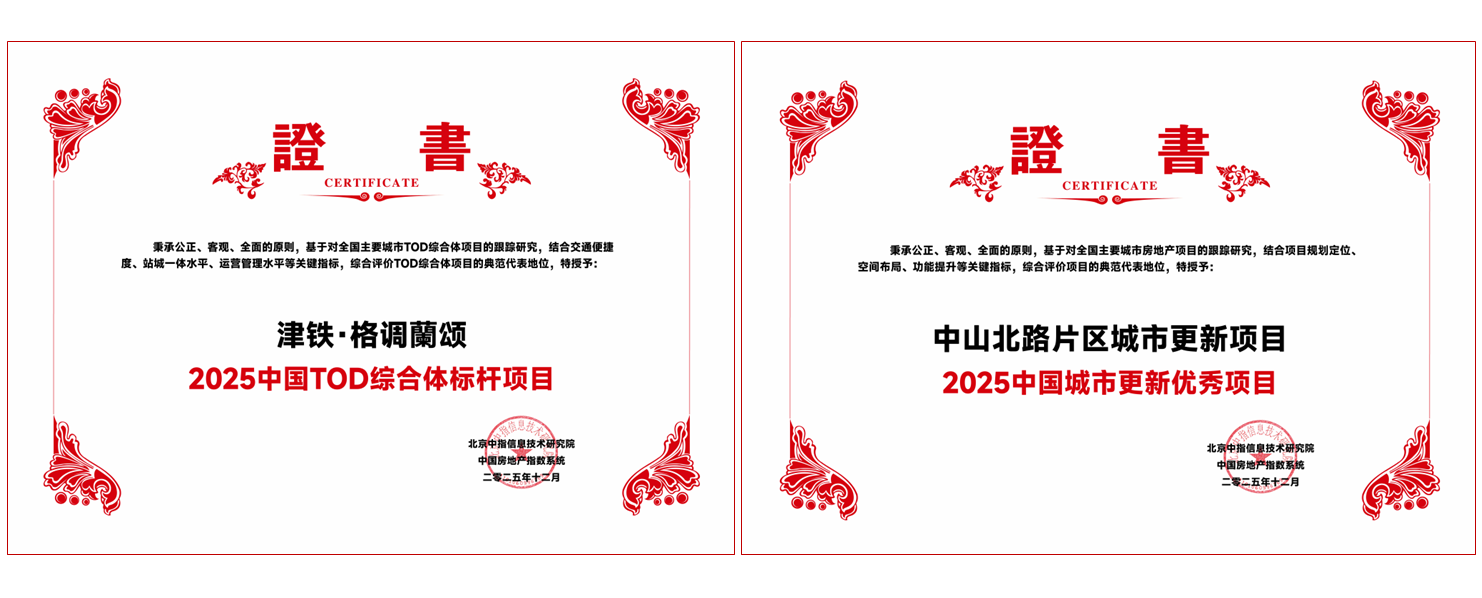2025年12月11日,由北京中指信息技术研究院主办的“2025中国房地产大数据年会暨2026中国房地产市场趋势报告会”正式召开,天津轨道交通集团实施的津龙湾周边片区城市更新项目(新建项目:津铁·格调蘭颂)获得“2025中国TOD综合体标杆项目”,中山北路片区城市更新项目获得“2025中国城市更新优秀项目”。