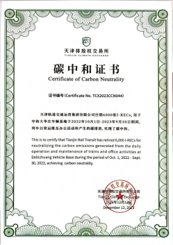 为积极响应国家“碳达峰、碳中和”目标,践行天津轨道交通绿色城轨发展行动方案要求,天津轨道交通集团积极推进大毕庄车辆段“分布式光伏+空气源热泵+能源智慧管理”多要素绿色低碳应用。日前,大毕庄车辆段通过碳排放核查及碳中和评估,取得了天津排放权交易所颁发的“碳中和证书”,成为天津轨道交通行业首个取得“碳中和”认证的车辆基地,充分展现了集团在绿色示范方面的引领作用,天津轨道交通在绿色升级转型上迈出了坚实一步。