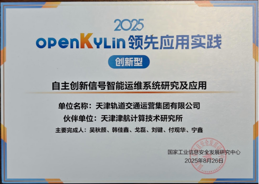近日,津铁通信公司“自主创新信号智能运维系统研究及应用”项目,获国家工业信息安全发展研究中心颁发的“openKylin(国产开源操作系统)领先应用实践”认证,该项目主要是openKylin系统在9号线信号智能运维系统中的首次实践应用,也是国产操作系统在轨道交通智能化领域的创新应用。