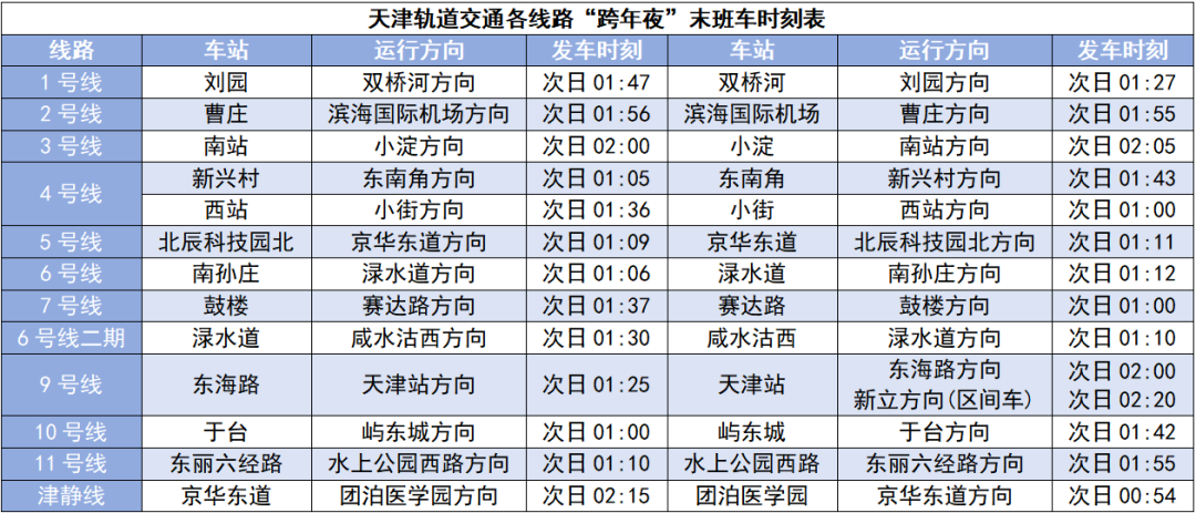 根据乘客出行需求,2025年12月31日晚间天津轨道交通全网延长运营服务时间2.5小时。