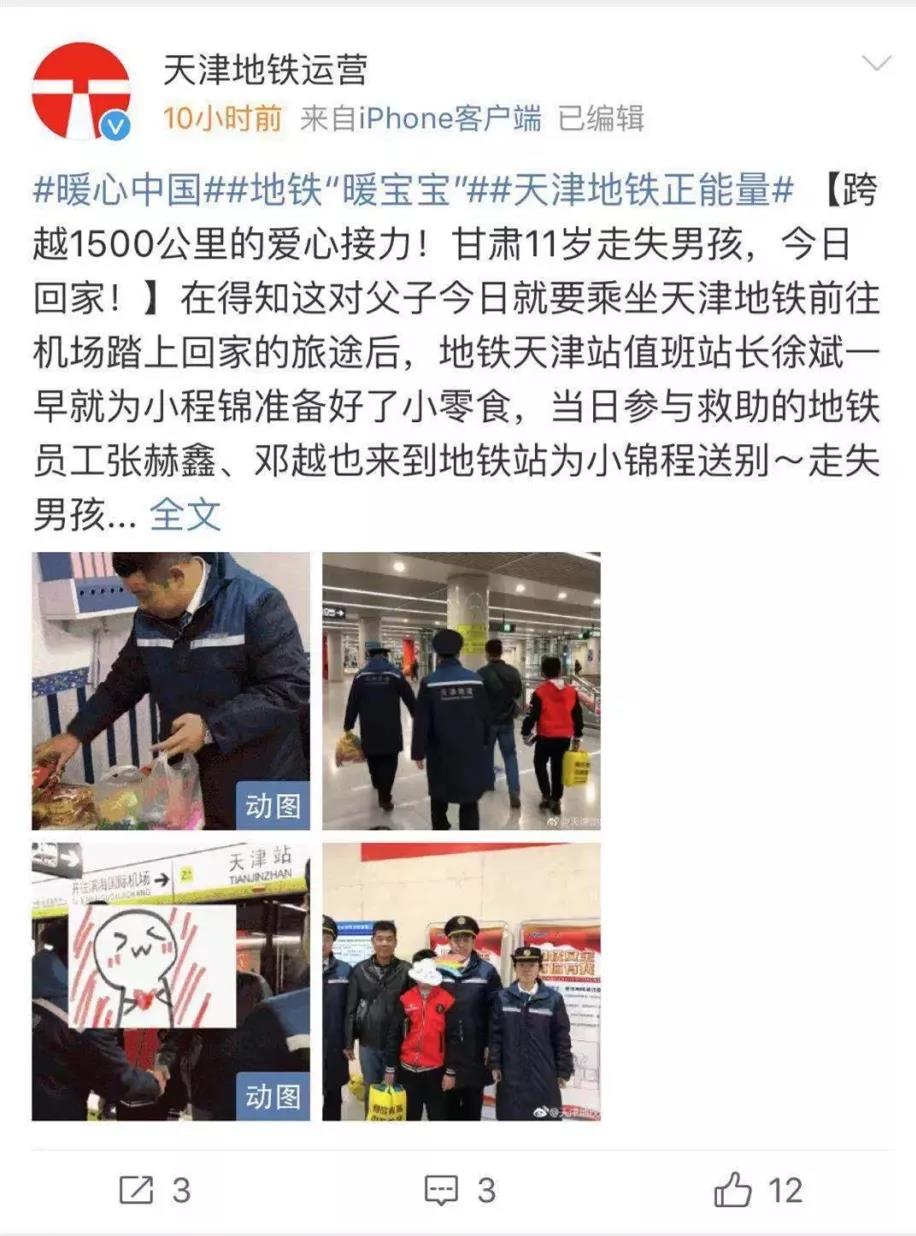 在27日当晚,天津地铁运营官方微博及时联系兰州媒体,将找到走失男孩的消息及时发布。